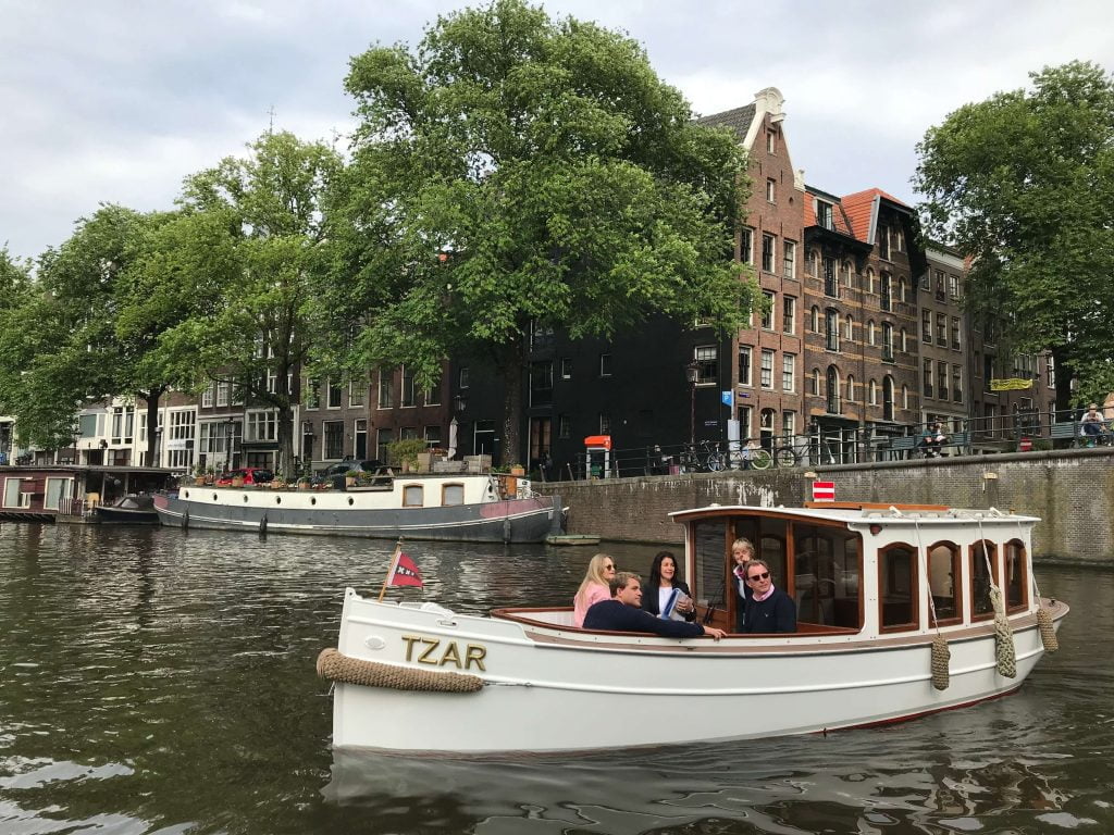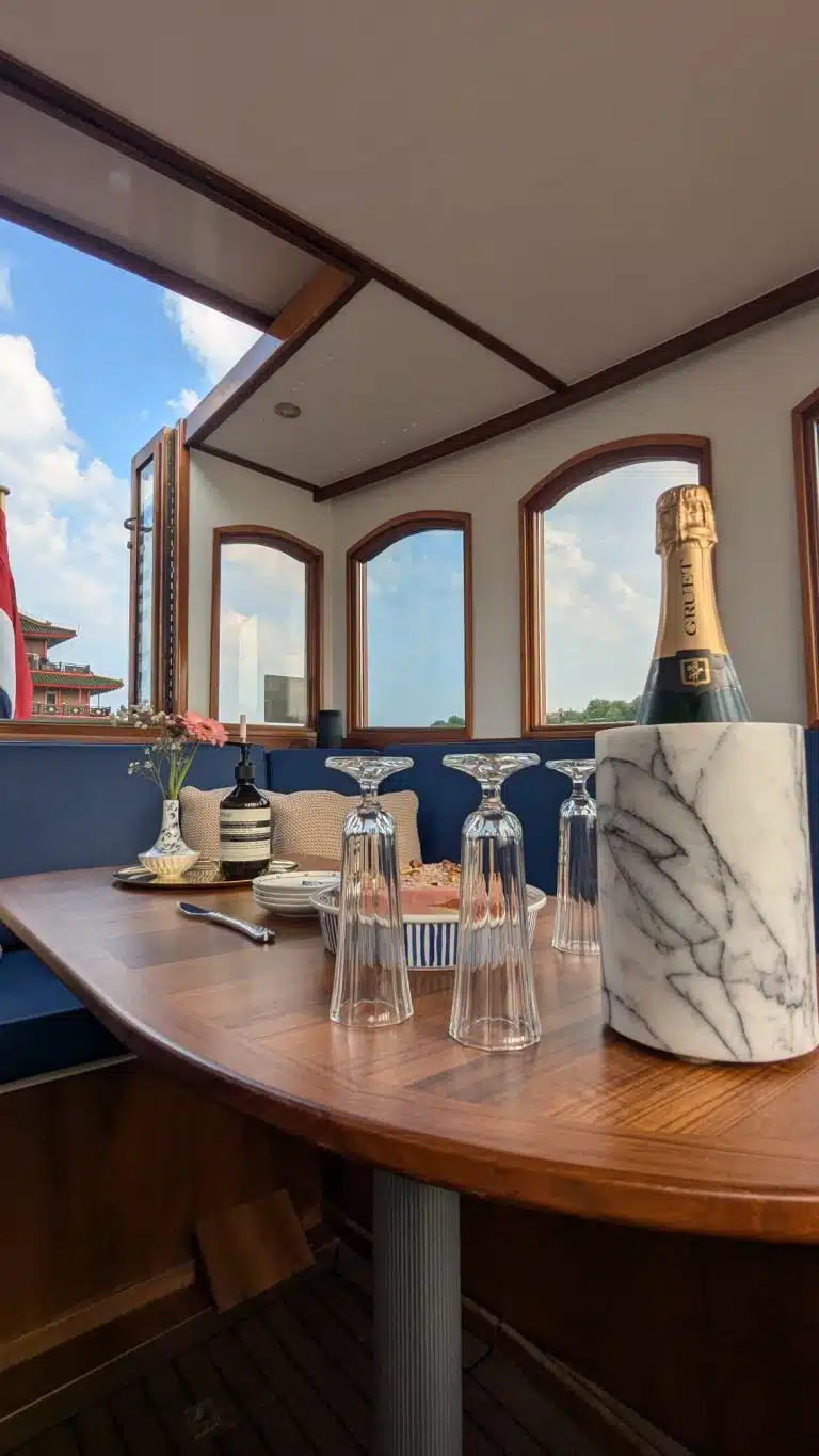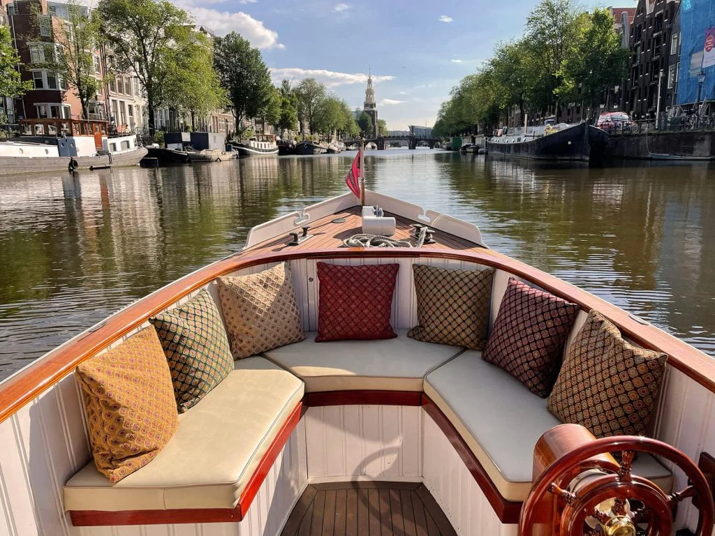 登上 Tzar,感受阿姆斯特丹最具代表性的私人游船魅力。Tzar 是阿姆斯特丹最具标志性的私人游船,融合经典设计与现代舒适,为宾客带来专属的奢华航程。她独特的船首开放空间为您呈现无遮挡的城市景致,是夏日阳光下最受欢迎的水上之选。若您偏好阴凉,我们可开启滑顶天窗,让清风流动于舱内。